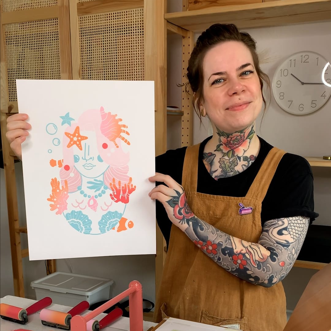 Die Faszination für farbenfrohe Tattoos begleitet mich seit meinem 18. Lebensjahr und es war nur eine Frage der Zeit, bis ich diese Leidenschaft auch beruflich verfolge. Als Linoldruckkünstlerin habe ich 2018 den Einstieg in die kreative Selbstständigkeit gewagt, das Tätowieren war der nächste, ganz natürliche Schritt. Besonders gern entwerfe ich bunte, florale und verspielte Motive, inspiriert von Popkultur, Natur und einer Prise Magie.